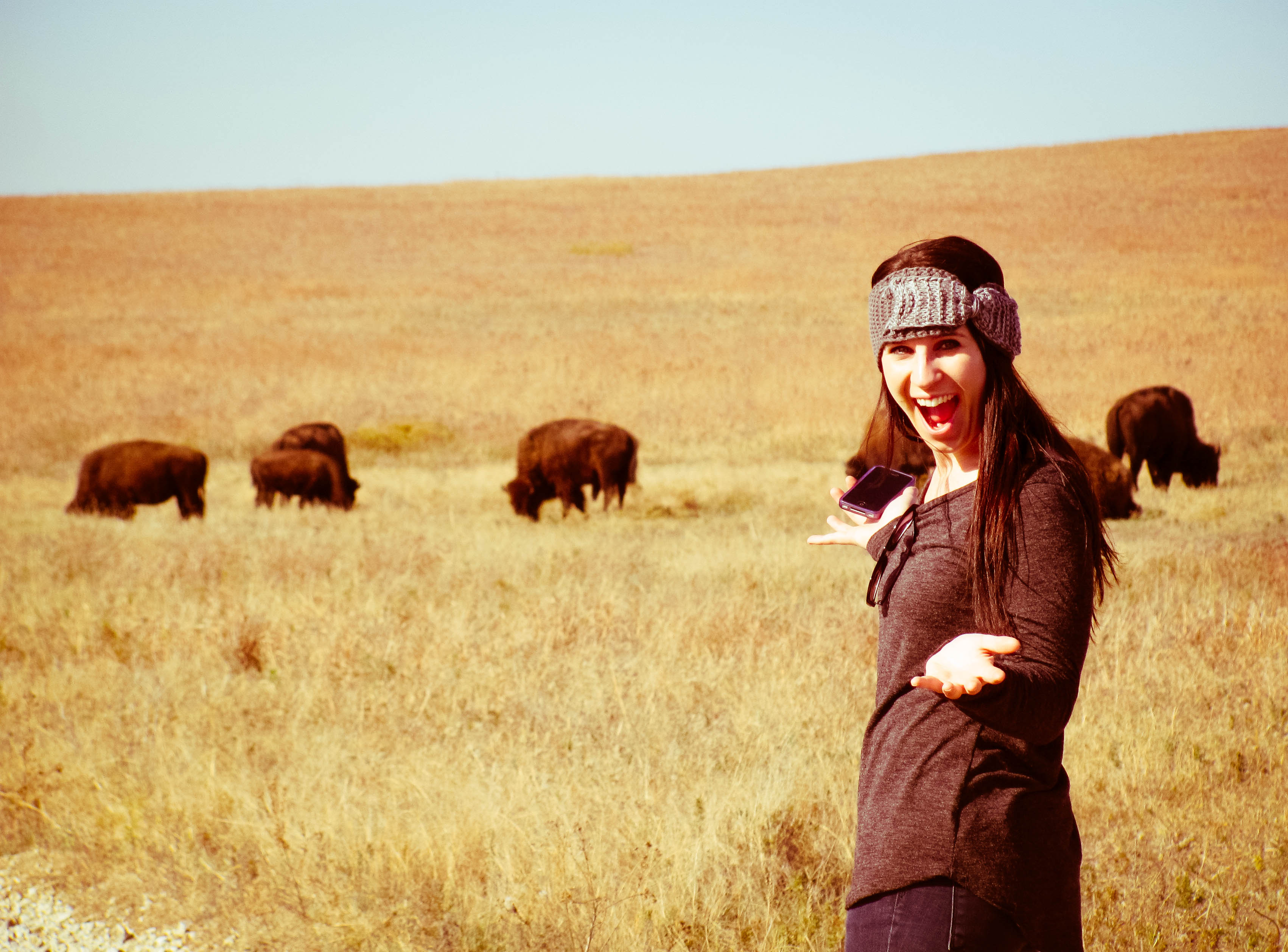 We finally arrived in a small town called Emporia. There we got off the highway and turned onto long country roads that went right through the prairies. We passed ranch after ranch of flat pastures and black cows. When we got to the Tallgrass Prairie National Park we could barely contain our excitement. We went into the visitors center and asked the tall Park Ranger where we could find the buffalo. He pointed out an 11,000 acre square in which they usually roamed. He mapped out some trails and said maybe, just maybe, if we hiked in this direction, we would catch a glimpse. We set out. Not daunted by 11,000 acres at all! It was gorgeous! The hike was invigorating. We walked for over an hour. Enjoying the grassy prairies, the sunny day, and the wide openness. You could see for miles and miles and we were the only people. It was one of the most beautiful places I have ever been. Finally I spotted some dark figures far in the distance. I zoomed in on them with my camera, you still couldn’t see very well, but the shapes were definitely not that of a cow. Liz practically sprinted in their direction. We hiked another half hour or so, around lazy hills and through grassy paths and then right in front of us was the herd. Twenty-two buffalo stood in our path. Grazing, roaming, rolling in the dirt and eyeing us cautiously. We were ecstatic!