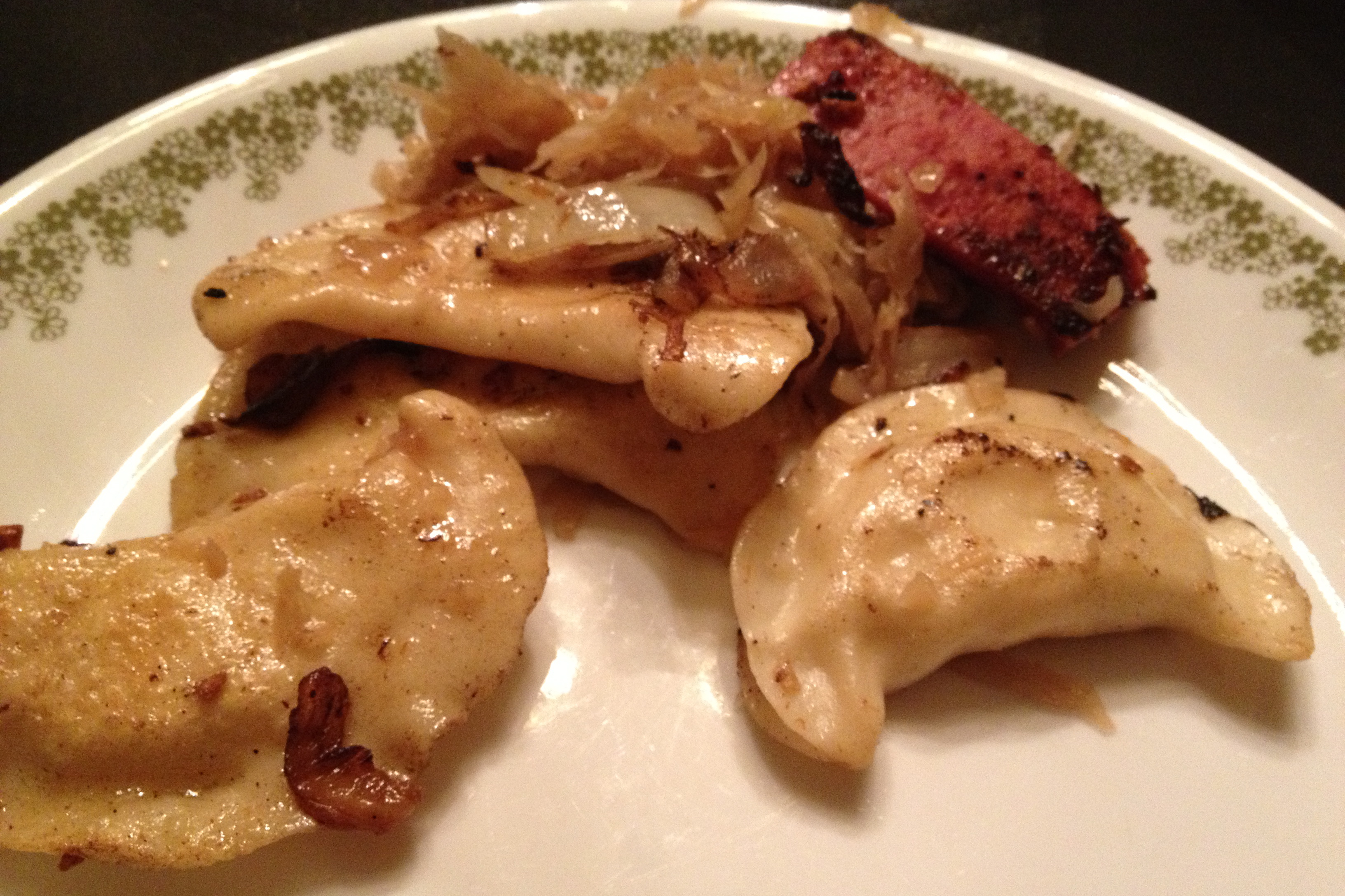 Then fried the pierogies with some onions and garlic. Then everything goes into a pan all together. sauerkraut, kielbasa, & pierogies. We popped it in the oven for a few minutes to make sure everything was warm.