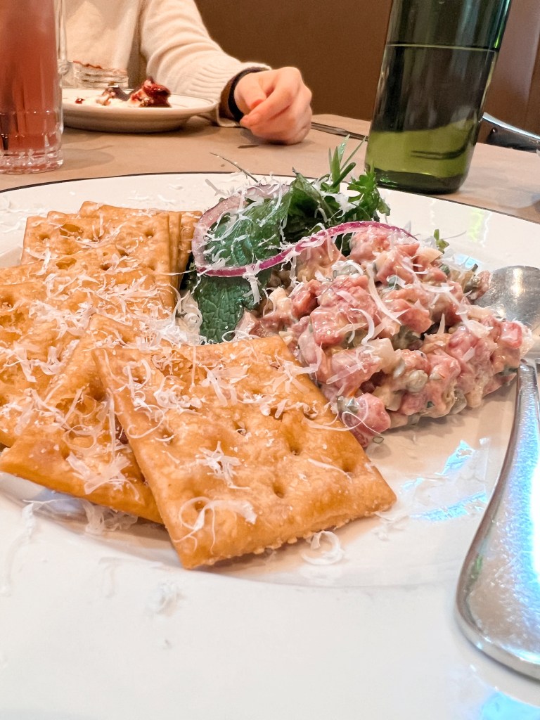 One standout dish that never fails to captivate my palate is the steak tartare, served with crispy saltines that add the perfect crunch. Paired with a freezer-cold martini that maintains its icy chill from start to finish, it’s a combination that never fails to impress.