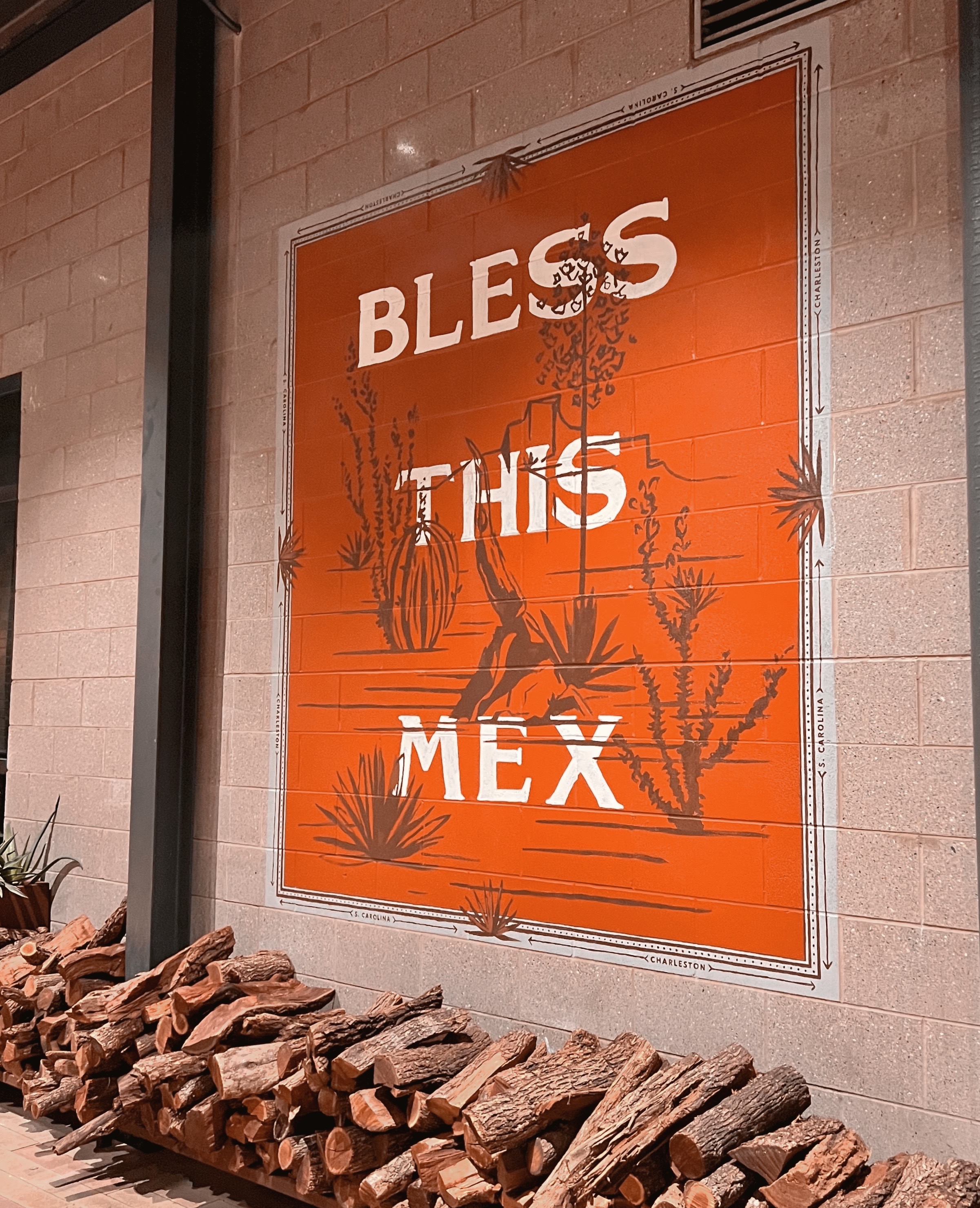 I was so excited to get to try Rancho Lewis this week in Charleston. Chef and Pitmaster, John Lewis, has already been made famous for his bbq restaurant, Lewis, and this new restaurant, “a place where West Texas, Chihuahua, Mexico, and New Mexico meet” did not disappoint. It was busy when we arrived. They don’t take reservations, and the wait time was estimated to be about an hour. The courtyard was lively. Rancho Lewis has a small outdoor bar so you can get delicious margharitas while you wait. We promptly ordered a few and sat down to enjoy. They were strong and fresh and deliciously flavorful. To our delight, the wait ended up being only 15 ish minutes and we were ushered inside to our table. The Texan ranch style decor transported us to a different world. The attention to detail creates a relaxing and immersive atmosphere, from Mexican Equipale Barrel Chairs, longhorn cattle skulls, to lovely Mexican artesania paintings.